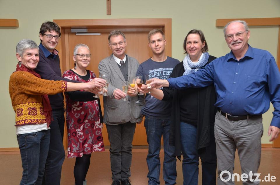 Andrea Kleber, Uli Münchmeier, Ulrike Kießling, Thomas Stahl, Claudia Reinl und Hermann Bibel (von links nach rechts) sind die gewählten Kirchenvorstände in der evangelischen Kirchengemeinde. Stadtpfarrer Dieter Schinke (Mitte) stößt auf erfolgreiche und harmonische sechs Jahre mit den Gemeindevertretern an.