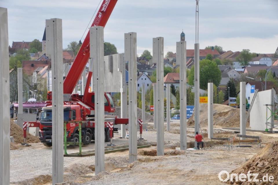 Fast im Sauseschritt entsteht auf dem E-Center-Gelände der neue Einkaufsmarkt. Kaum waren die alten Mauerreste abgeräumt, karren die beauftragten Unternehmer die neuen Betonfertigteile für das neue Gebäude heran. Inzwischen können Beobachter schon klar die neuen Ausmaße des Vollsortimenters erkennen. Die Mitarbeiter der Firma massivbau Betonfertigteilwerk aus Lichtenfels befestigten die rund sieben Meter hohen Betonstelen in den dafür vorbereiteten Fundamenten.