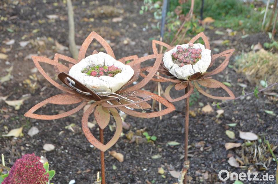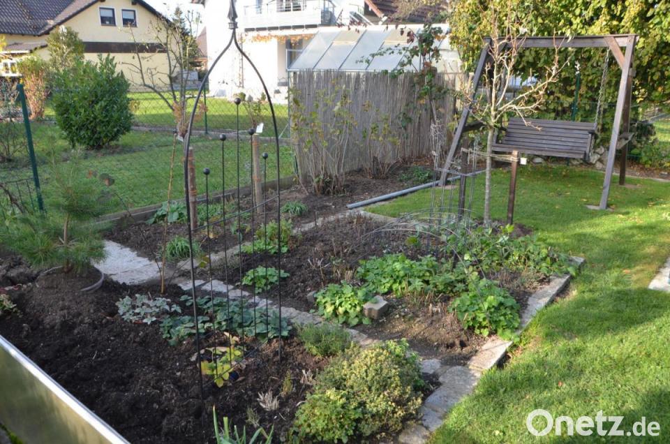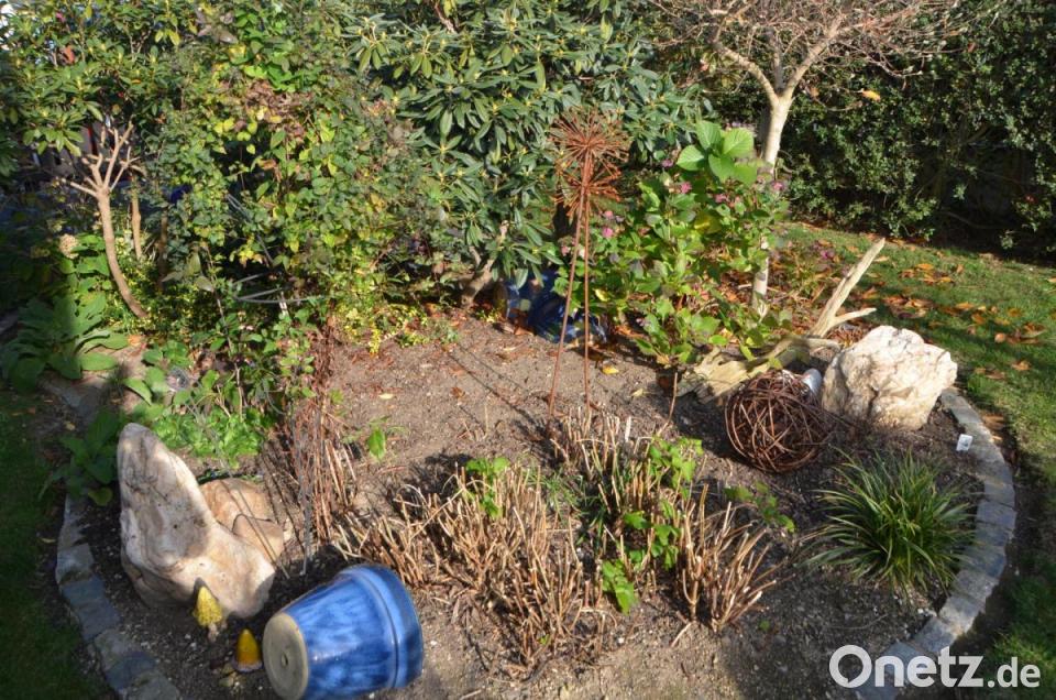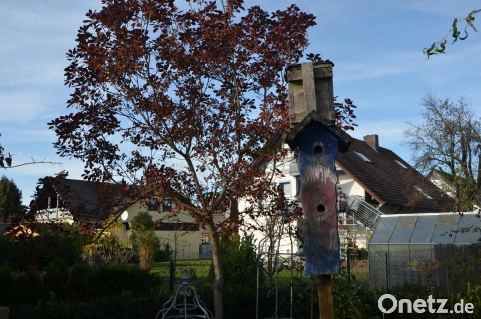 Nur ein paar Schritte von der Terrasse entfernt wartet neben der Begrenzungsmauer zum Nachbarn das erste kleine Herbstwunder: Mitten in der dunklen Erde die bereits umgestochen ist, schlängelt sich eine rote Dahlie durch den Zaun in Nachbars Garten und hält ihre Blüte den Schatzsuchern entgegen. Davor wollen die letzten Salatköpfe noch geerntet werden. Schaut man an der Terrasse nach oben, entdeckt man einen reich bestückten Blauregen, der sich um die Kletterhilfen rankt und noch wie mitten im Sommer, den Freisitz vor zu heftigen und heißen Sonnenstrahlen schützen will. Freilich die blau leuchtenden Blüten sind längst verschwunden. Gieler arbeitet gerne in ihrem Garten, auch wenn es manchmal schon über ihre Kräfte geht. Sie hat aber in Gerhard einen fest zupackenden Ehemann, der ihr bei allen schwereren Arbeiten unter die Arme greift. Büsche und Stauden säumen die verschlungenen Wege. Dazwischen viel Accessoires zum Staunen. Es gibt viel zu entdecken.