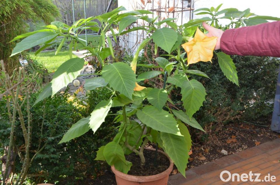 Im Winter schließlich verwandeln Reif und Frost sie in filigrane Kunstwerke. „Auch für den gelb blühenden Oleander wird es langsam Zeit, ins Winterquartier zu wechseln“, meint Gieler und holt gleich die Sackkarre aus dem Schuppen. Zwar verträgt der Oleander tiefere Temperaturen bis zu Minus 5 Grad Celsius. Er freut sich, wenn er noch etwas länger im Freien verbringen darf, als all die anderen Kollegen. Doch irgendwann geht es ganz schnell und es heißt umziehen. „Gegossen wird eher selten“, verrät die Vohenstraußerin. „Alle vier Wochen gebe ich den Pflanzen eine kleine Ration Wasser.“ Dazu gehören auch die Engelstrompeten, für die Gieler ein ganz besonderes Händchen beweist. Allerdings brauchen diese Kübelpflanzen auch ganz viel Wasser. „Wenn mein Mann nicht das Wasser von der nahen Brauchwasserstelle gleich neben dem Bauhof holen könnte, wäre es nicht mehr machbar, diese durstigen Blumen zu halten.“ Und weil der Frühling bereits im Herbst beginnt und der Blütenreigen für das Jahr 2020 gut vorbereitet werden will, sind die Knollen bereits alle im Haus.
