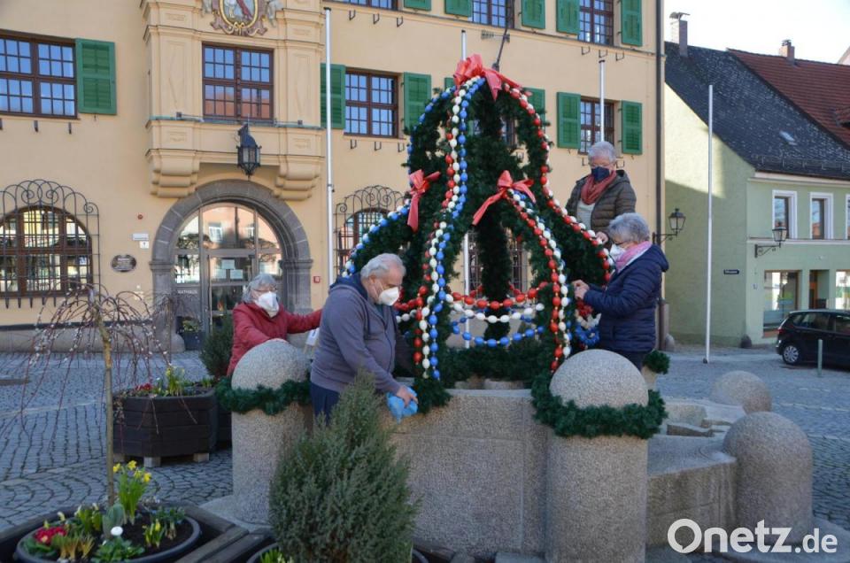 Da hüpfte am Mittwochnachmittag bestimmt der Hase vor Freude, so entzückt war er, als fleißige Helfer der Siedlergemeinschaft den Brunnen vor dem Rathaus in einen Osterbrunnen verzauberten und ihn mit Ostereiern und Schleifen in den Stadtfarben schmückten.