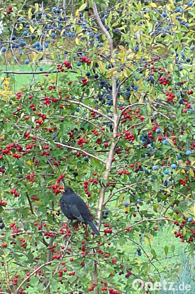 Inmitten des reich mit bunten Früchten bestückten Geästs aus Schlehen und Hagebutten weilt der Vogel mit seinem dunkelschwarzen Gefieder wie im Schlaraffenland. Das Nahrungsangebot aus einem Sommer mit üppig vollen Obstbäumen scheint heuer fast unerschöpflich.