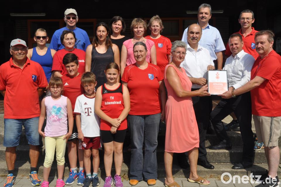 TV-Vorsitzender Klaus Nigg (rechts) und Geschäftsführerin Manuela Völkl (links) nehmen die Sonderpreis-Urkunde von den Sparkassenvertretern Josef Pflaum, Verwaltungsratsvorsitzenden Andreas Wutzlhofer und Gerhard Hösl (von links) entgegen. Mit dabei sind viele Sportler und Abteilungsleiter Andreas Eger (links), der sich seit Jahren für die Ablegung des Deutschen Sportabzeichens einsetzt.