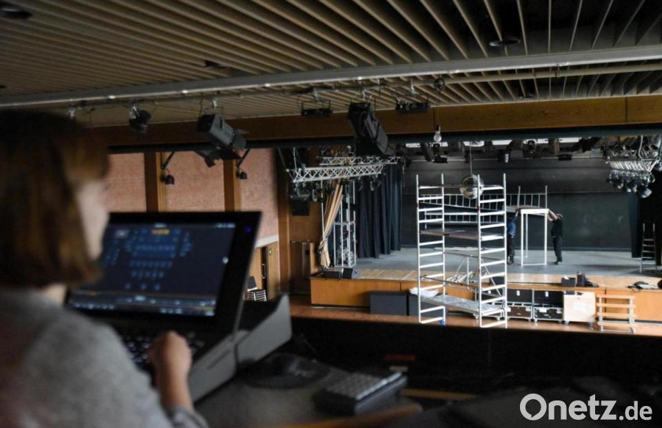 Zwei Techniker ziehen eine Strahler-Leiste unter die Decke der Vohenstraußer Stadthalle. Die Pressesprecher des Landestheaters Oberpfalz (LTO), Adrian Wenck und Verena Piehler packen die neuen LTO-Segel aus. Geschäftsführer Wolfgang Meidenbauer trägt eine Discokugel zur Bühne. Die Vorbereitungen für den Theatertag am Sonntag laufen.