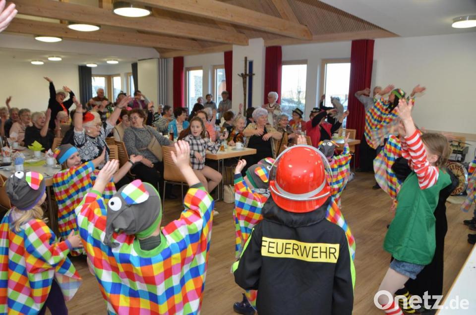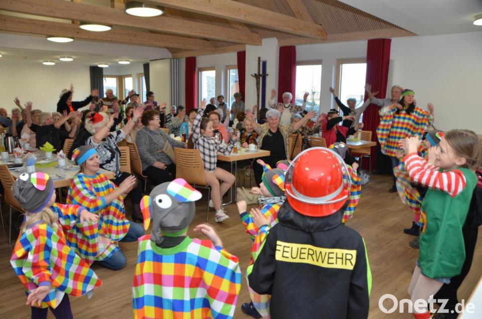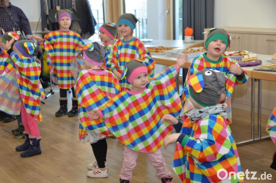 Als die Kinder auftauchten, wurde es gelb, orange, rot, rosa, lila, blau, grün und schwarz oder weiß. Elmar bringt nämlich alle grauen Elefanten so richtig zum Lachen, denn er kennt viele Streiche und hat jede Menge Unfug im Kopf. „Der Elefant tanzt heut‘ Samba und ruft dabei laut Karamba. Zuerst macht er sich einmal warm und streckt sich hoch so weit er kann. Er hält den Rüssel in die Lüfte und kreist dabei auch seine Hüfte. Er schwingt sie einfach hin und her, Samba tanzen mag er sehr“, hopsten die Kinder im Takt und luden die Senioren ein, es ihnen gleich zu tun.