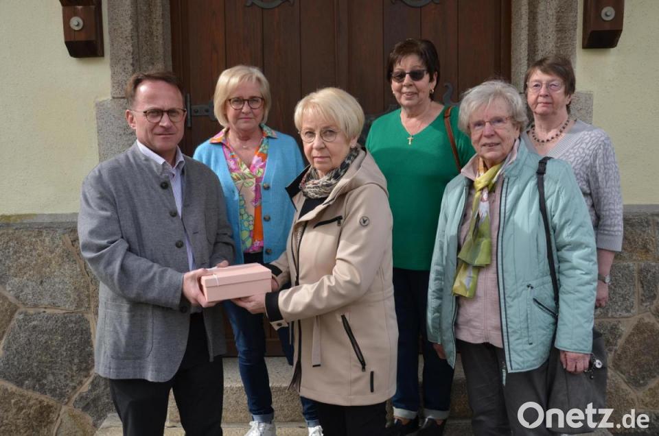 Gertraud Balk, Martha Simacek, Hilde Baierl, Traudl Stich und Ingeborg Bock (von links) bastelten, stickten und kreierten Palmbuschen und Osterdekoartikel. Insgesamt nahmen sie so die stolze Summe von 2144,31 Euro ein, die sie nun an Dekan Alexander Hösl (links) für die anstehende Renovierung der Stadtpfarrkirche übergaben.