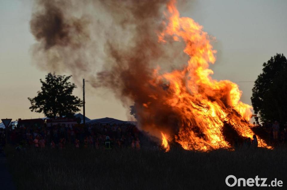 Vor der Dorfkirche St. Thomas in Oberlind loderte das Johannisfeuer der Schützen auf dem Fußballplatz im Ortsteil und bot ein wunderbares Motiv. Bereits zu Beginn der Dunkelheit war der aufgeschichtete Holzstapel niedergebrannt und die Besucher konnten sich in Ruhe den Genüssen widmen. Zur Sicherheit war auch die Ortsteilwehr vor Ort.