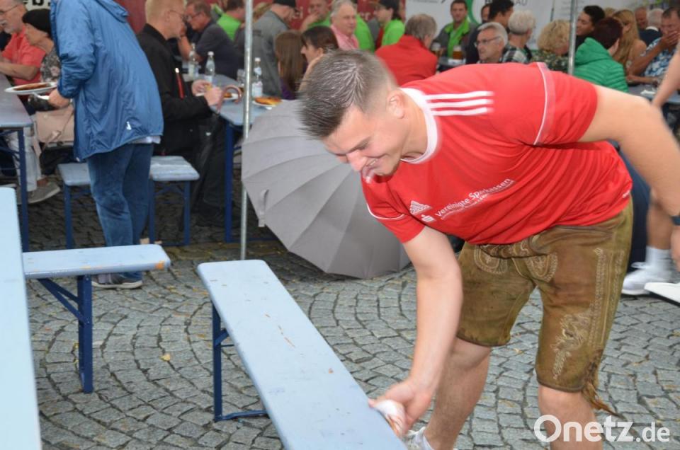 Wer dachte, das Fest hätte sich damit erledigt, wurde schon eine Stunde später eines Besseren belehrt. Die Kicker, normalerweise um diese Zeit mit mehreren Bierkrügen in den dichten Besucherreihen unterwegs, zogen ausgerüstet mit Duschabzieher und Putzlappen flink durch die Reihen und schon waren die Plätze für die Gäste wieder abgetrocknet sitzbereit. In verschiedenen sozialen Medien hielten die Fußballer zuvor Kontakt zu den Altstadtfestbesuchern, die sich wenige Minuten später aus allen Himmelsrichtungen auf den Weg in die Innenstadt machten. Ehe man sich versah, waren die Bierbänke auch schon bis zum letzten Platz belegt.