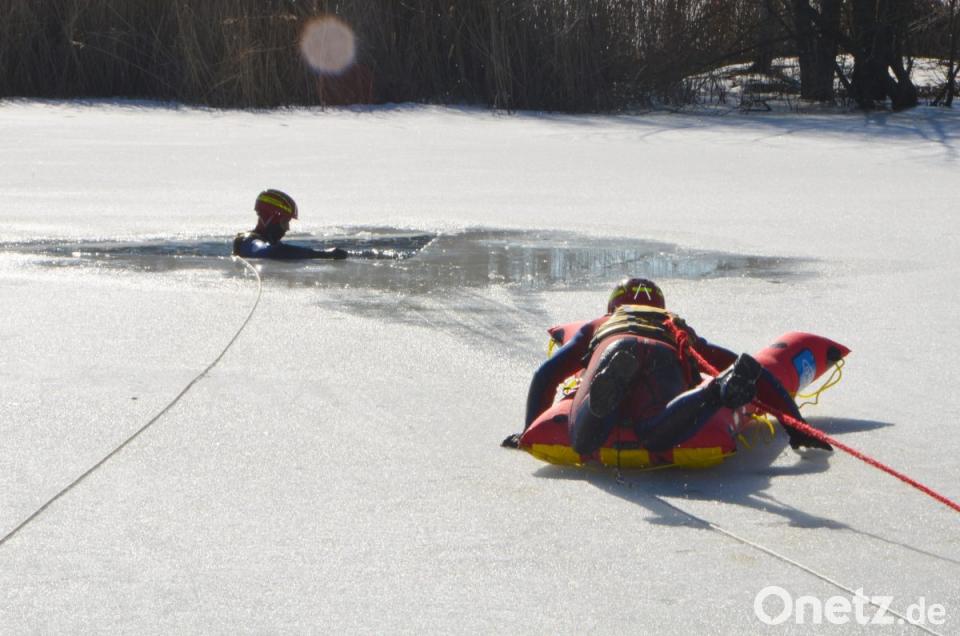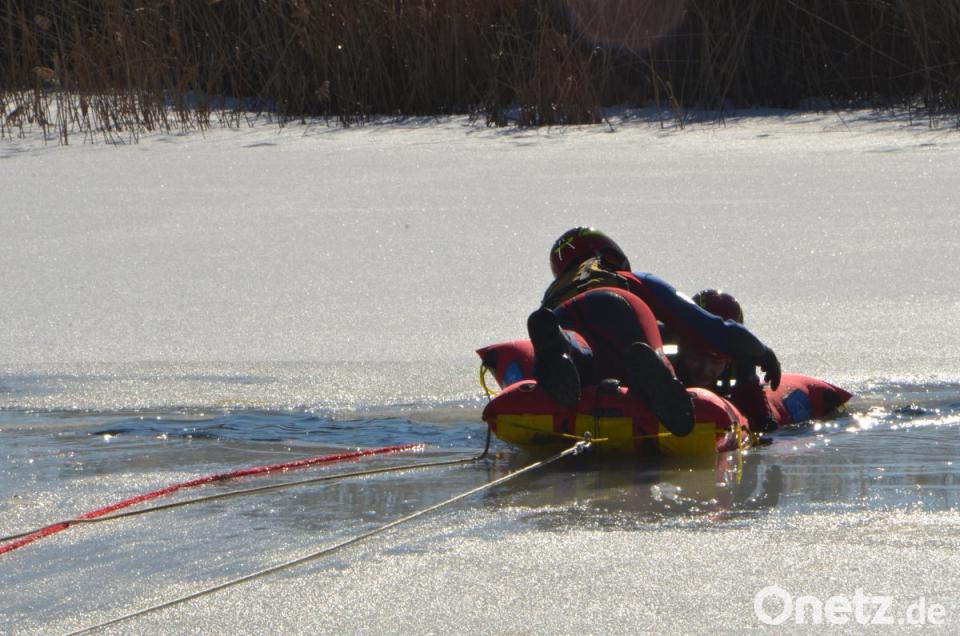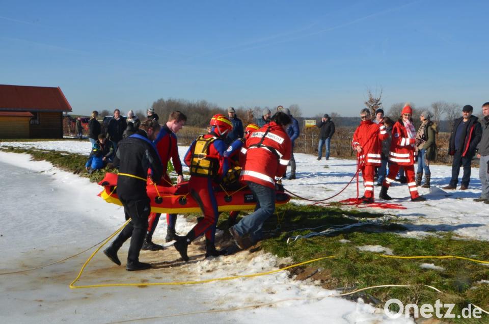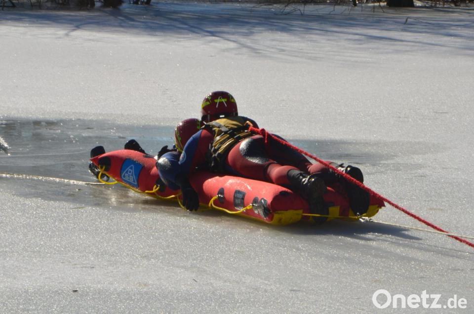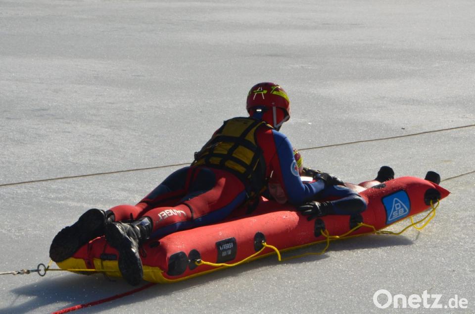 Bei der praktischen Übung näherten sich die Retter dem Verunglückten blitzschnell über die Eisfläche mit dem Eisrettungsschlitten. Schnell packten ihn die Helfer mit großer Kraft und zogen ihn behände mit Hilfe der Einsatzkräfte am Ufer auf rettenden Boden. "Der Unterkühlte darf nicht bewegt und nur liegend transportiert werden", erklärten die Experten den Zuschauern.