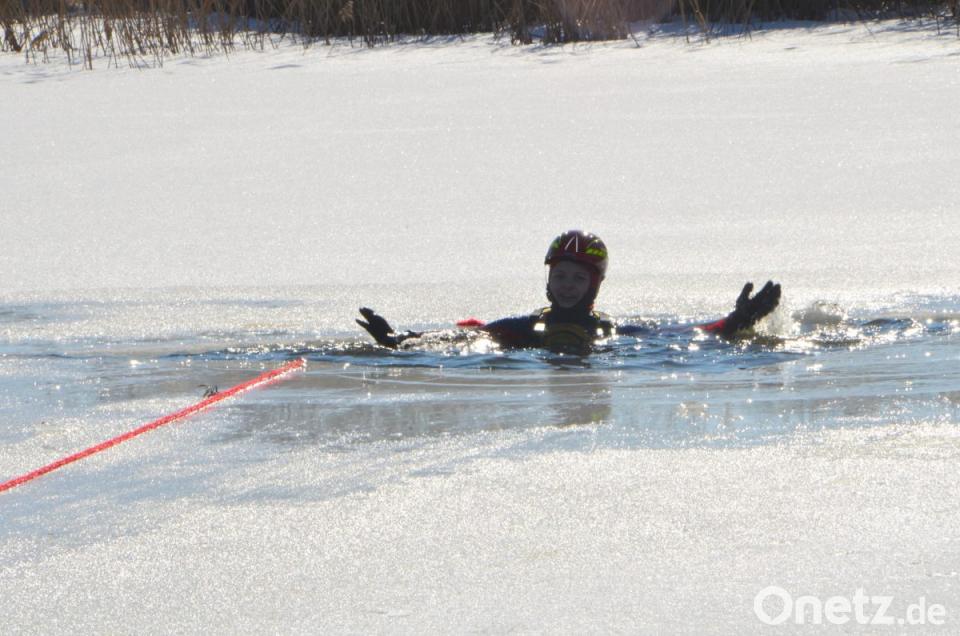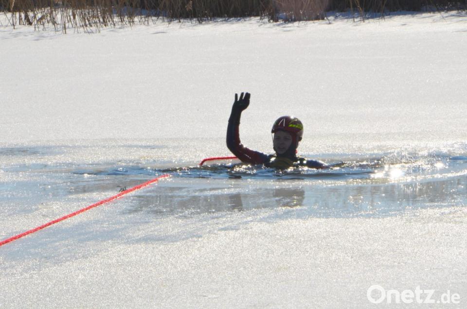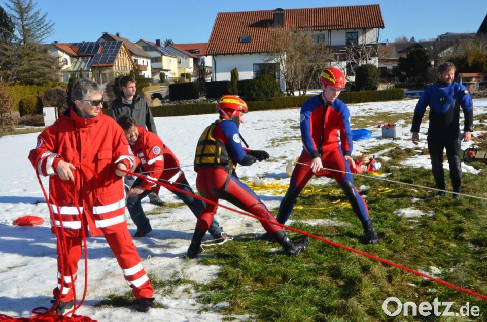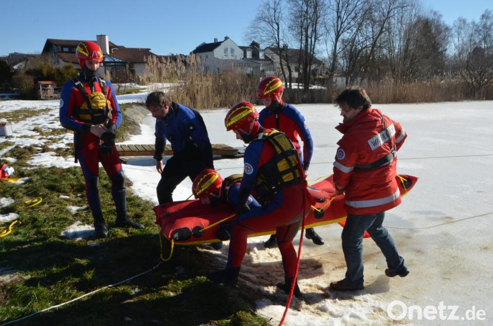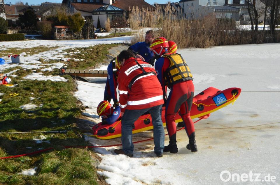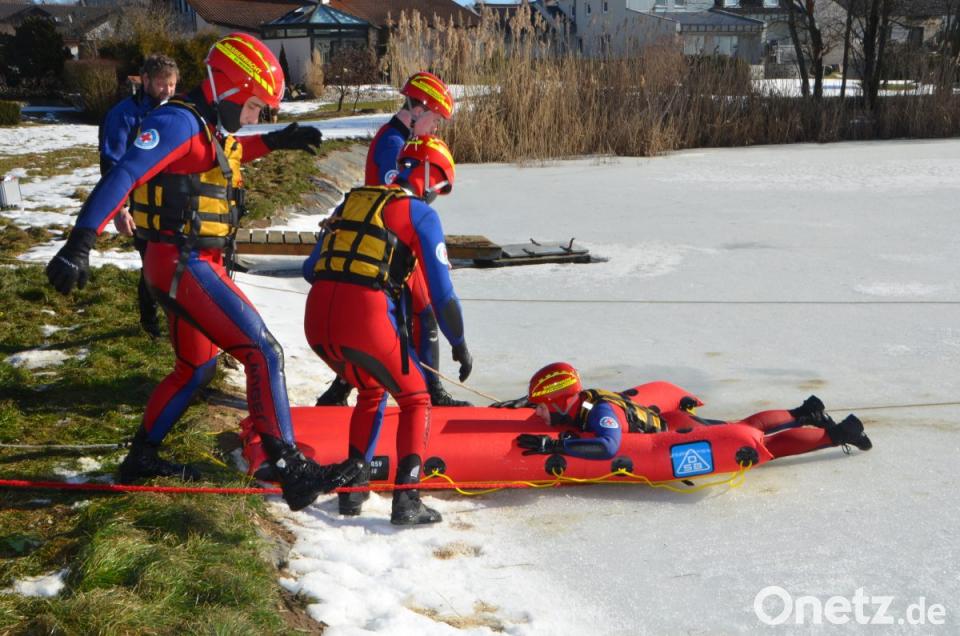 Witterungsbedingt sind die Übungsmöglichkeiten sehr begrenzt und nur durch aufwändige Sicherungsmaßnahmen möglich. Die technische Leiterin Julia Eger schaffte es aber trotzdem, wieder eine praktische Vorführung zu organisieren. Zuvor unterwies Rettungsschwimmausbilder Andreas Artinger das Team in Theorie und gab praktische Tipps. Rettungstaucher Martin Frischholz hatte vor der Aktion die Eisfläche überprüft. Er war überrascht, dass der Weiher noch so dick zugefroren war. "Das war selbst von außen nicht erkennbar." Er öffnete die 20 Zentimeter dicke Eisfläche mit der Motorsäge und schnitt einen gehörigen Block heraus "Wir wollen mit dieser Übung den praktischen Kenntnisstand auffrischen und den Umgang mit der Ausrüstung üben", erklärte Artinger. Im Notfall müsse alles sehr schnell gehen: Wasserrettungsanzüge überstreifen und den Eisrettungsschlitten bereit machen. "Professionelle Zusammenarbeit ist oberstes Gebot der Retter", meinte der Rettungsschwimmer.