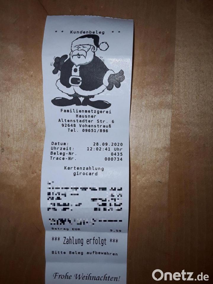 Gisela Süß aus Ragenwies fiel es anfangs gar nicht auf. Erst als sie ihr Mann Peter darauf hinwies, nahm sie den Kassenbeleg der Metzgerei Hausner aus Vohenstrauß nochmal näher unter die Lupe. Sie hatte am 28. September dort eingekauft und mit Karte bezahlt. Auf dem Kassenbeleg wünscht eine Weihnachtsmann-Illustration "Frohe Weihnachten".