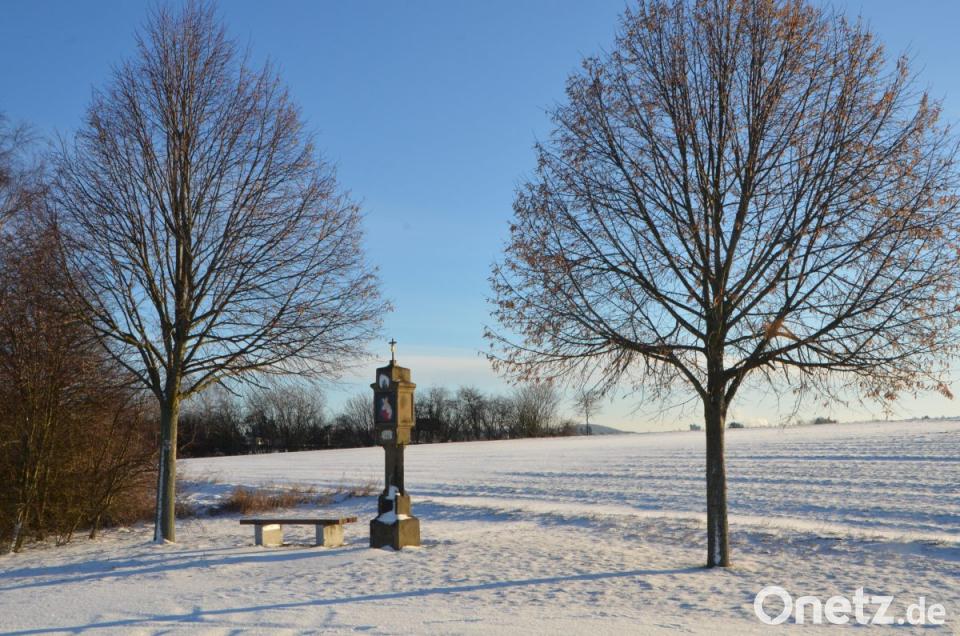 Wie gemalt steht es an einem sonnigen Wintermorgen da, das Wolf-Jackl-Marterl, an der Straße zum Kalvarienberg zwischen Vohenstrauß und Oberlind, unmittelbar an der Fußgängerunterführung der Umgehungsstraße. Mit freier Sicht auf Leuchtenberg lädt es die Besucher zu einem beschaulichen Halt in einer traumhaften Naturwelt ein. Still ist es an diesem Platz, wenn nicht gerade ein Auto vorbeifährt. Die Luft so klar, dass alle Konturen wie mit Schere ausgeschnitten scheinen. Der Himmel blau wie gemalt und der Schnee weiß wie Zuckerwatte. Das wirksamste Mittel gegen eine Wintertrübsal ist gratis und hat keinerlei Nebenwirkungen: eine sonnige Bank zum Durchatmen und Innehalten. Hier, auf diesem Bänkchen, dürfte die Zeit stehen bleiben.