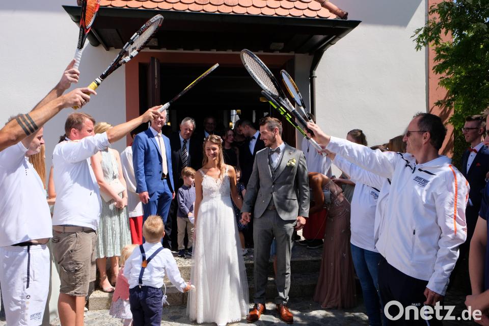 Geduldig warteten derweil schon die Tennisfreunde Oberbibrach und einige Fußballer des FC Vorbach auf ihren großen Moment des Spalierstehens nach der Trauung. Der Hintergrund: Das Paar verbindet auch sportliche Interessen. Schon dreimal Mixed-Champion der Tennisfreunde Oberbibrach pflegen Anna und Patrick das Spiel mit dem gelben Ball. Der frischvermählte Ehemann gehört zu den Stützen des Vorbacher FC. Da war es selbstverständlich, dass Tenniscracks und Fußballer zu den ersten Gratulanten gehörten.