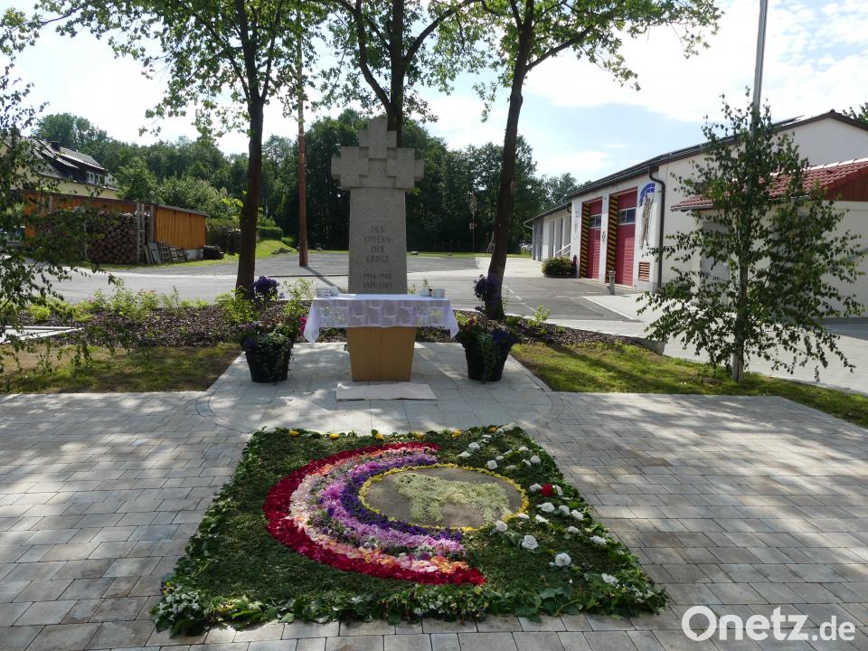 Nach dem Gottesdienst zogen in einer feierlichen Prozession zahlreiche Gläubige, die Fahnenabordnungen der Feuerwehr Vorbach sowie der Krieger- und Soldatenkameradschaft, Kommunionkinder und ein starker liturgischer Dienst durch den Ort und machten Station an den vier Altären, deren Vorfeld von zahlreichen helfenden Händen mit Blumenteppichen farbenfroh gestaltet hatten. Die Blumenteppiche vor der Kirche St. Anna und in der Ortsmitte vor dem Kriegerehrenmal waren ein besonderer Blickfang.