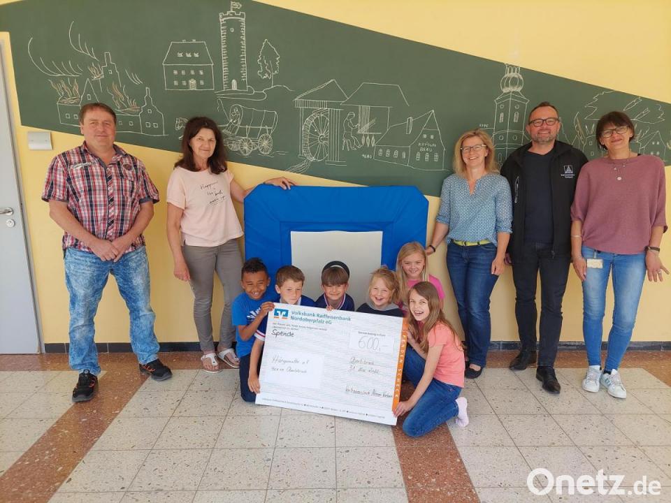 Ilona Schmidt, Michael Grünthaner (von rechts) sowie Martin Melchner (links) übergaben in Oberbibrach an Carmen Kräml und Gertrud Schwindl (Zweite und Dritte von links) beachtliche 600 Euro aus der Maiabzeichen-Spendenaktion der Firma Novem. Die Kinder aus der Mittagsbetreuung freuten sich mit ihren Betreuerinnen über die willkommene Unterstützung.
