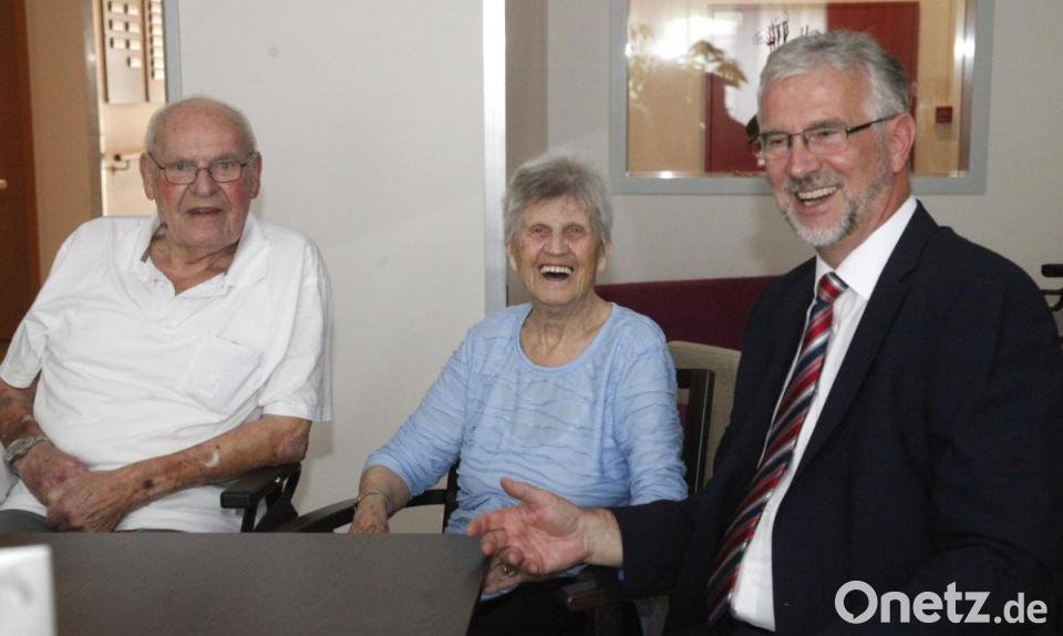 Anita Bergmann (Mitte) stammt aus Schleswig-Holstein, machte regelmäßig Urlaub in Bayern und zog im Alter ganz hierher. Inzwischen wohnt sie zusammen mit ihrem Mann Werner (94, links) im Margarethenhof in Wackersdorf. Dort bekam sie am Samstag Besuch vom stellvertretenden Bürgermeister Günther Pronath (rechts), der ihr zum 95. Geburtstag gratulierte. Das Ehepaar Bergmann heiratete am 24. Dezember 1949 und kann damit am „Heiligen Abend“ die „Gnadenhochzeit“ feiern. Zur Familie gehören neben den drei Kindern fünf Enkel und acht Urenkel.