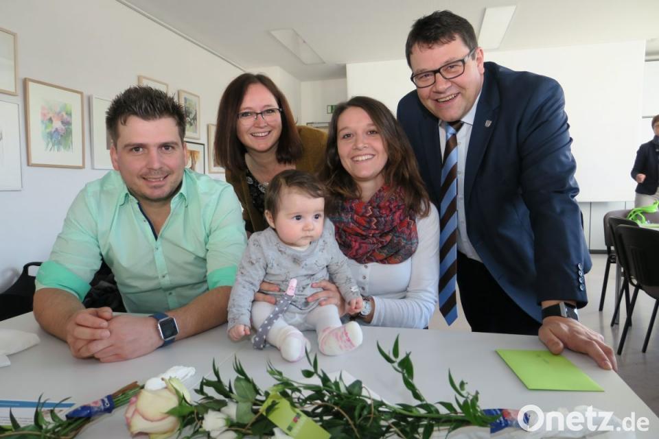 Die vier Monate alte Lena ist die Enkelin von Bürgermeister Thomas Falter. Sie saß mit ihren Eltern am Tisch, als der Opa 24 junge Familien zum 14. Neugeborenen-Empfang der Gemeinde willkommen hieß. Bei einem gemeinsamen Frühstück am Samstag im Mehrgenerationenhaus brachte der Bürgermeister die Wertschätzung der Gemeinde für die jungen Familien zum Ausdruck und überreichte ihnen eine Tasche mit Badetuch und Spielente, Blumen für die Mutter und Süßigkeiten für die Geschwister. Die Gemeinde erhielt 2016 die Auszeichnung "Familienfreundliche Kommune". Der Neugeborenen-Empfang, der zweimal im Jahr stattfindet, war damals ein Kriterium für die Preisvergabe. Das Bild zeigt die junge Familie Lena, Nicole und Michael Stopfer mit den Großeltern Elke und Thomas Falter.