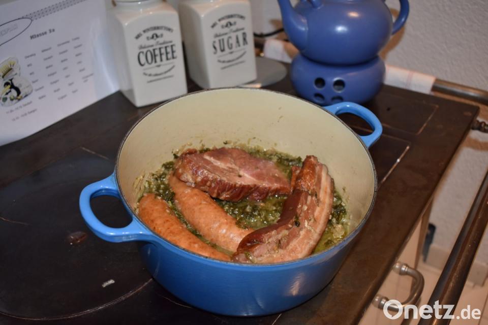 Den Grünkohl mit wenig Wasser, Schmalz, gehackten Zwiebeln, Salz, Pfeffer und Nelkenpfeffer aufsetzen. Speck und Schweinefleisch im Stück darauflegen und das Gericht zugedeckt zirka 120 Minuten dünsten. Das Fleisch muss gar sein und die Flüssigkeit fast ganz verdunstet.