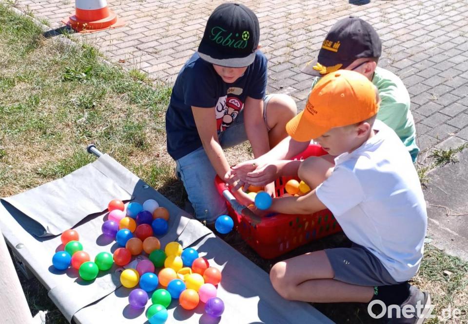 Zurück an Gerätehaus und Dorfspielplatz waren dann verschiedene Stationen aufgebaut, die es in Teamwork zu meistern galt. Die Vierergruppen stapelten sie Figuren aus Bierkisten und füllten Eimer mit Wasser für die Kübelspritze, um mit vereinten Kräften die Ziele wegzuspritzen. Selbst die Krankentrage der Feuerwehr wurde zum Spielgerät umgebaut: Mit ihr mussten Bälle im Slalom transportiert werden.