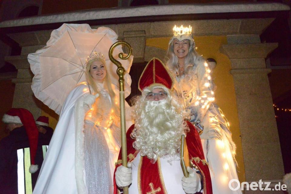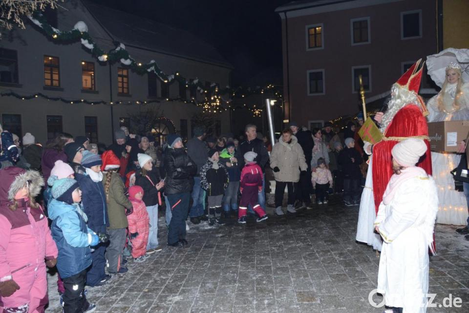 Dicht umlagert die Stände mit Glühweih, Fruchtspießen, Bratwürsten und Waffeln. Absoluter Höhepunkt dann aber der Einzug von St. Nikolaus, den Daniel Grötsch verkörperte. Er wurde diesmal nicht nur von vielen freiwilligen Helfern begleitet, die dem Nikolaus das Tragen der Süßigkeiten abnahmen, sondern erstmals von einer überdimensionalen Schneekönigin und einer Eisprinzessin vom Theater "Sinnesrausch" aus Schwarzenfeld. Natürlich für viele Eltern der Moment, in dem das Handy für ein gemeinsames Bild mit den Kindern gezückt wurde. Später tanzten dann auch noch die Schwarzachtaler Perchten vor der Schule.