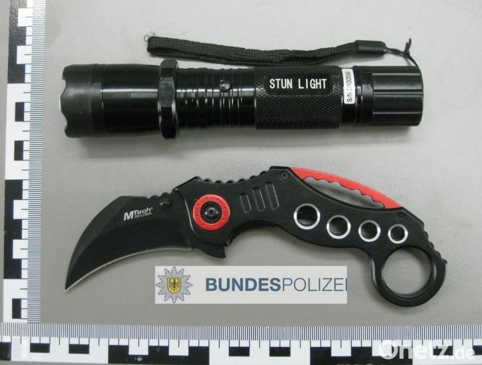 Ein Karambitmesser, (sogenanntes "Caramba") und eine als Elektroschocker umgebaute Taschenlampe beschlagnahmten Fahnder der Waidhauser Bundespolizei bei der Kontrolle auf der A6 am Sonntagmorgen. Bei dem Karambitmesser handelt es sich in seiner Ursprungsform um ein sichelförmiges Gartenmesser mit Fingerloch aus dem asiatischen Raum. Nach dem deutschen Waffengesetz darf es in der Öffentlichkeit nicht mitgeführt werden. Verboten allerdings war die Taschenlampe in der Fahrzeug-Mittelkonsole des 29-Jährigen. Die vermeintliche Leuchte lässt sich laut Mitteilung der Bundespolizei per Knopfdruck in ein Elektroimpulsgerät verwandeln, das Stromstöße mit mehreren tausend Volt aussenden kann. Beide Waffen des Mannes beschlagnahmten die Fahnder. Der Mann erhielt eine Anzeige wegen Verstößen gegen das Waffengesetz.