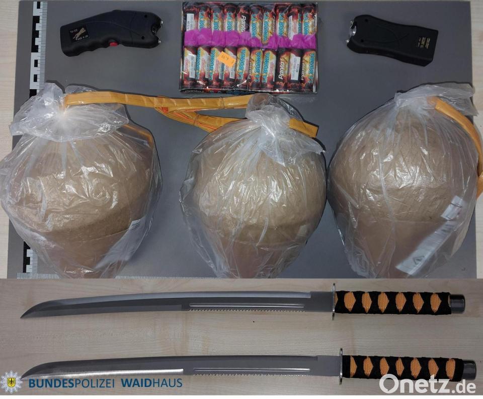 Am Wochenende hat die Bundespolizeiinspektion Waidhaus bei Grenzkontrollen auf der Autobahn A 6 und im Bereich Waldsassen zahlreiche verbotene Gegenstände sichergestellt. Zu den Funden gehörten Samurai-Schwerter, Elektroimpulsgeräte, verbotene Messer, Potenzmittel, ein Reizstoffsprühgerät sowie illegale Feuerwerkskörper. Die Beamten leiteten mehrere Verfahren wegen Verstößen gegen das Waffen-, Arzneimittel- und Sprengstoffgesetz ein.