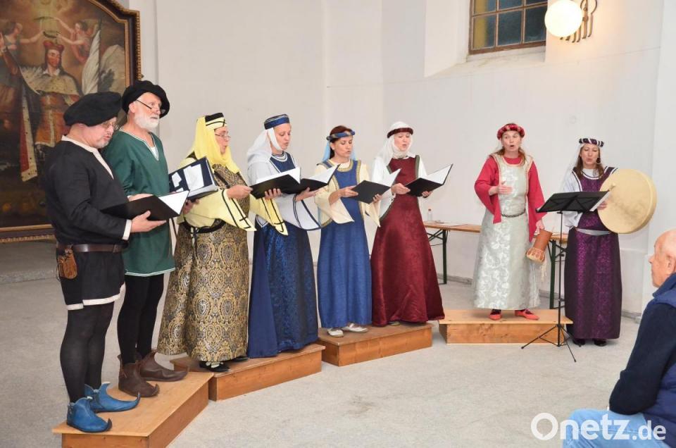 Passend zur mittelalterlichen Musik startete der Chor in historischen Gewändern mit einem vielstimmigen Gloria das Lob Gottes. Dazu erklang ein sanft geschlagenes Tamburin. Die sechs Frauen- und zwei Männerstimmen verzauberten das altehrwürdige Gemäuer, in dem am Samstagmorgen der Festgottesdienst zu "30 Jahre Fall des Eisernen Vorhangs" gefeiert wird.
