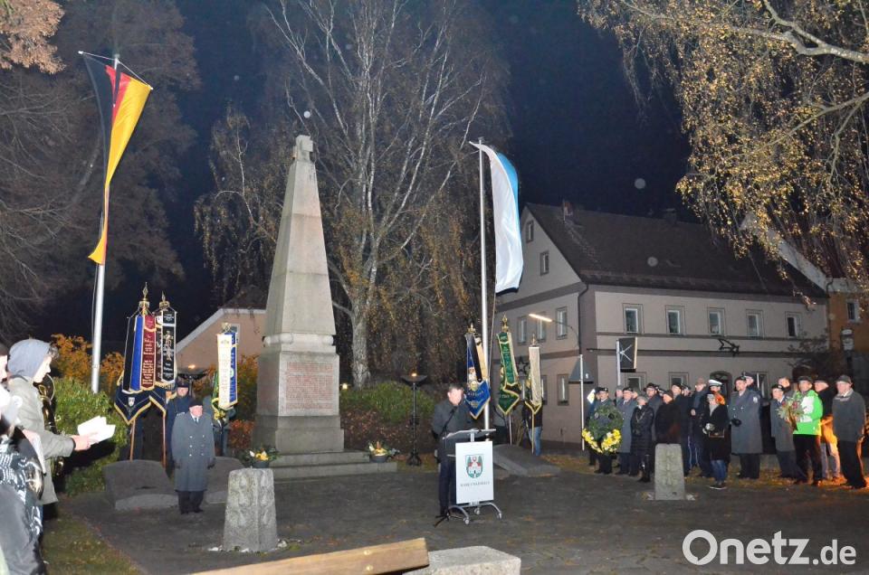 Gedanken des Erinners verband Pfarrer Georg Hartl mit seiner Predigtansprache. Bauhofleiter Johannes Grötsch übernahm die Vorbereitung des Ehrenplatzes. Als erstes Manko erwies sich in der Dunkelheit für die Mitglieder des Vereinsorchesters des Musikvereins das Lesen der Noten. Fackelträger mussten abgestellt werden, um den Musikern ihre Grundlage während der Märsche und an der unbeleuchteten Stelle des Kriegermahnmals zu erhellen.