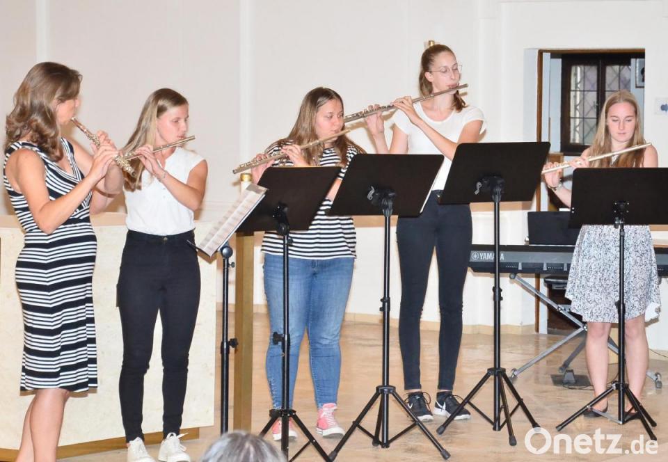 Auf fünf Querflöten glänzte der fünfminütige Genuss von Mozarts „Zauberflöte“ durch Lena Hagn, Lena Sollfrank, Marie Würschinger, Barbara Neuber und Gerlinde Gläser. Stimmenreich von oben schloss sich aus Verdis Oper die Overtüre aus „Nabucco“ an. Walburga Puff, Tobias Bierler, Melanie Nahrhaft und Hannah Helm erweckten den „Triumphal-Marsch“ aus der Oper Aida durch Trompeten zu einem impulsiven Ganzen. Auf „jahrelanges Üben“ führte Gerlinde Gläser die Qualität von Barbara Neuber (Querflöte) zurück, die als Solistin eine Andante in C von Mozart beitrug.