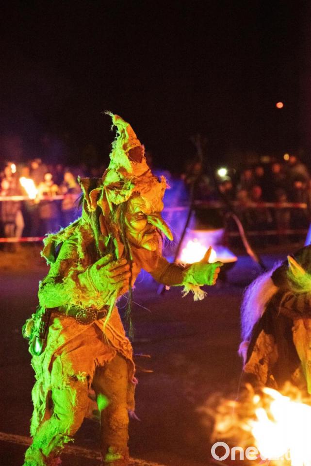 Angsteinflößende Masken, Kostüme und entsprechende Gesten in Richtung Zuschauer förderten das Gruseln und den Schrecken vom ersten Augenblick an. Doch die Faszination des begonnenen Ablaufs überstieg diese Gefühle schnell und ein bis in kleinste Details geplanter Ablauf steigerte die Spannung. Nicht nur, weil die zuerst agierende Hexenschar täuschend echt aussah. Die gesamte Show lebte von den Bewegungen der gefährlich scheinenden Wesen. Weil die dazu gehörenden Texte vom Band eingespielt wurden, war jedes Wort überall deutlich zu hören.