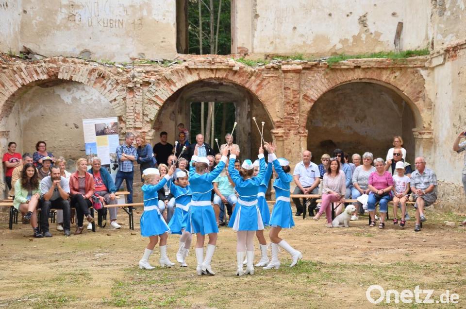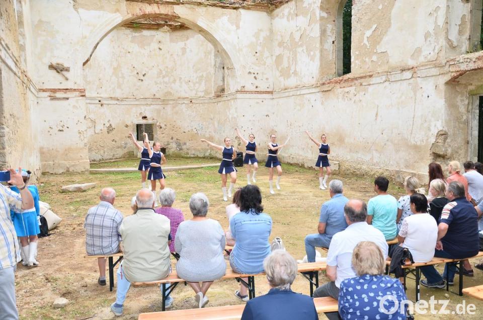 Mit Liebe zum Detail ausgewählte Kostüme unterstrichen die gezeigte Choreografie. Für die Einspielung aller Musiktitel genügte ein Handy und ein einziger Akkulautsprecher aufgrund der famosen Akustik inmitten der Ruine. Nach einer halben Stunde reichte zudem die vorbereiteten Sitzplätze nicht mehr, da immer noch Interessierte zur Aufführungsstätte kamen. Die kleinen Geschwister der Tänzerinnen liebten derweil längst die schmissigen Takte der Musik und wippten beständig begeistert mit. Für einen Teil der Besucher war es bereits eine hochwertige Einstimmung auf den Beginn der Waidhauser Sommerserenaden, die nach neuer Tradition in der Kirchengedenkstätte der Partner- und Nachbargemeinde am Mittwoch ihre Neuauflage starten.