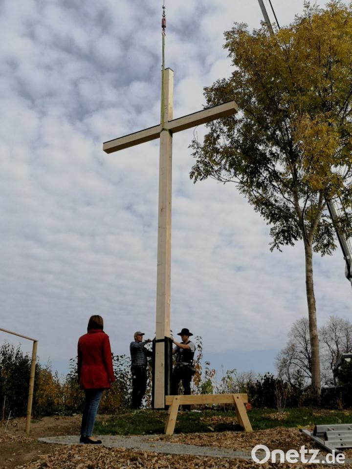 Für den Ersatz vertraute die Marktgemeinde auf das Können der ortsansässigen Zimmerei „Bannerweber“. Die Wahl fiel auf eine Ausführung in Fichtenholz mit Einblechung der horizontalen Balken in der bisherigen Originalgröße. Das alte Kreuz war nach fast 45 Jahren verwittert, morsch und vom Schwamm befallen. Eine Reparatur wäre nicht mehr möglich gewesen. Aus Sicherheitsgründen hatten es die Mitarbeiter des Bauhofs bereits im vergangenen Winterhalbjahr entfernt.