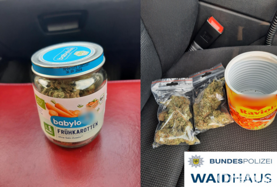 In der Hosentasche eines 30-Jährigen haben Beamte der Bundespolizei ein Glas mit vermeintlicher Kindernahrung entdeckt. Allerdings befanden sich in dem Karottenglas keine Lebensmittel, sondern Drogen. Laut einer Pressemitteilung kontrollierten Polizeibeamte am Samstagabend den 30-Jährigen bei der Einreise nach Deutschland in Waidhaus mit seinem Auto. In dem Behältnis befanden sich 8,45 Gramm Marihuana. Die Beamten stellten die Drogen vor Ort sicher.