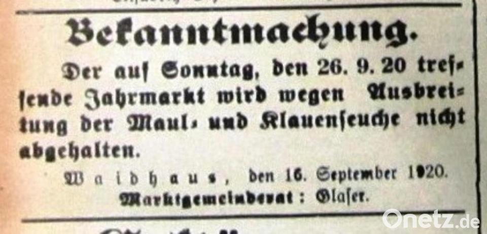 Der Waidhauser Frühlingsmarkt fällt in diesem Jahr aus, aber nicht wegen des allgemeinen Festverbots. Der Marktrat verständigte sich bereits vor der Coronakrise aufgrund mehrerer Terminüberschneidungen für diesen Schritt. Anders erging es dem Emmeramsmarkt vor 100 Jahren, den die Kommune zur Eindämmung der Seuche nicht abhalten durfte. Ein Inserat vom 16. September 1920 zeugt davon.