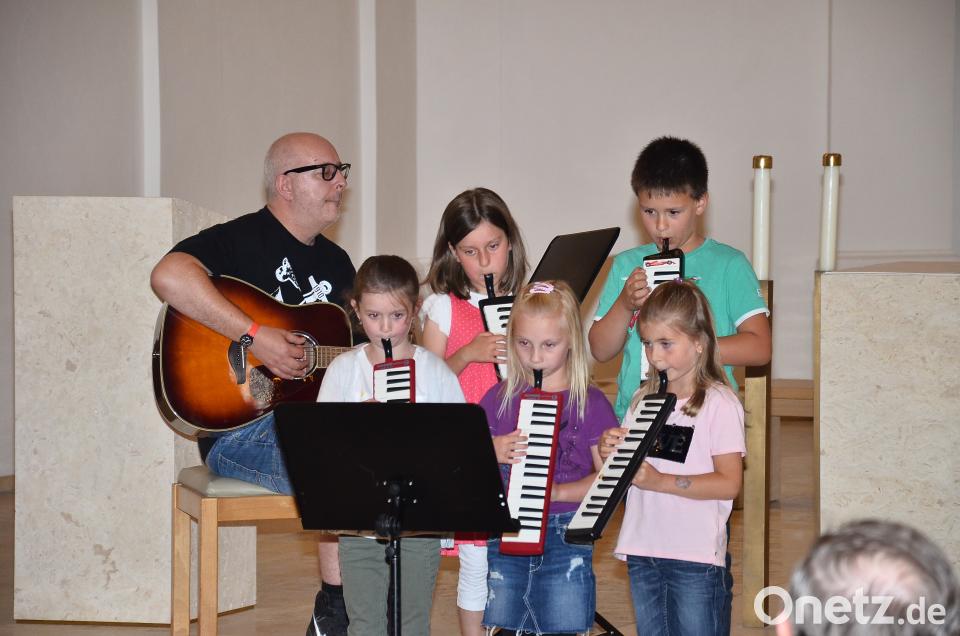 (fjo) Pfarrer Georg Hartl und Bürgermeisterin Margit Kirzinger überließen die Begrüßung dem musikalischen Leiter Hermann Mack und mischten sich selbst unter die große Schar von Instrumentalisten. „Gott liebt die Kinder“ ließen die Allerjüngsten gesungen und gespielt gleich zur Einstimmung wissen. Musiklehrer Wolfgang Schieder begleitete das Spiel der Schüler von Kornelia Kraus auf Melodikas mit seiner Gitarre.