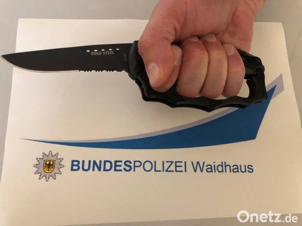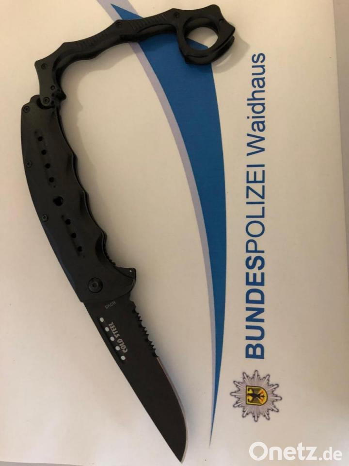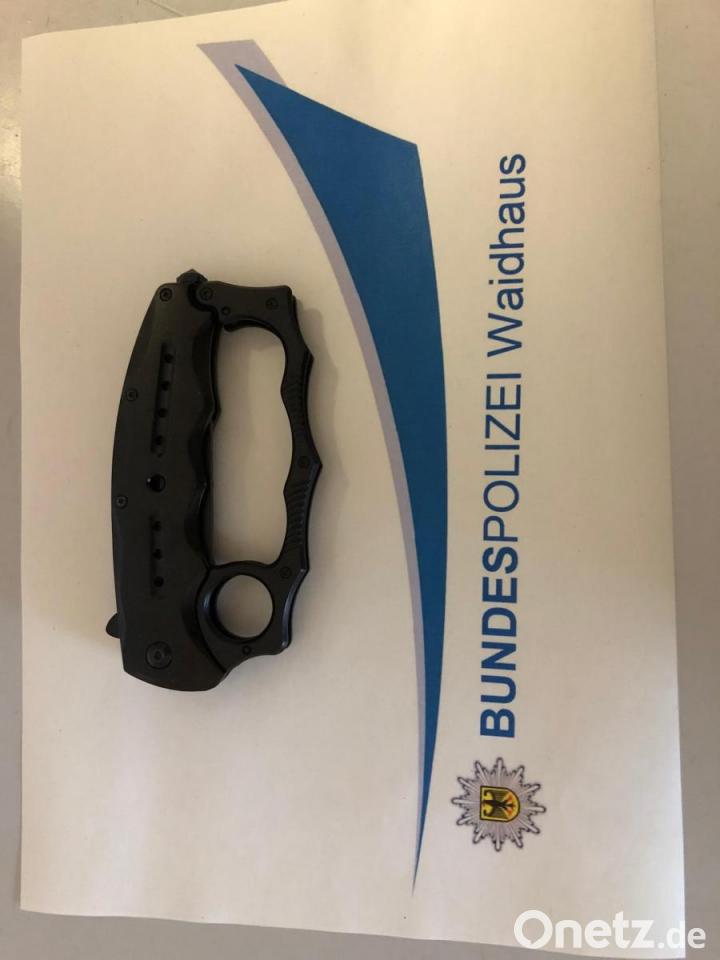 Zehn Zentimeter misst die Klinge des Springmessers, die die Bundespolizisten bei einem Italiener fanden. Das ungewöhnliche: die Schneide klappt aus einem Schlagring heraus. "Dieses kuriose Multitool ist verboten und ziert nun die Asservatenkammer der Bundespolizei", heißt es in der Pressemitteilung. Die Beamten hatten den Mann auf der ehemaligen B 14 bei Waidhaus kontrolliert. Der 25-Jährige wurde wegen Verstößen gegen das Waffengesetz angezeigt.