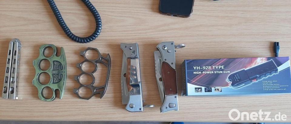 Insgesamt 17 verbotene Waffen haben Zivilfahnder der Bundespolizei Waidhaus am Wochenende sichergestellt. Das teilt die Bundespolizei mit. In Waldsassen hatte am Freitag ein 20-Jähriger ein verbotenes Butterflymesser im Gepäck. Am Samstag erwischten die Beamten vier Männer: einen 52-Jährigen mit einem Springmesser und einen 24-Jährigen mit einem Schlagring. Zwei 17-Jährige hatten ein ganzes Waffenarsenal in ihrem Auto aufgebaut: zwei Spring- und ein Butterflymesser, zwei Schlagringe und sogar ein Elektroimpulsgerät waren auf dem Rücksitz ausgebreitet. Am Sonntag haben die Beamten bei einem 30-jährigen Mann einen Schlagring, einen Wurfstern und zwei Wurfmesser sichergestellt, ebenso eine geringe Menge Marihuana. Bei einer Kontrolle in Pleystein hatte ein 31-Jähriger ebenfalls einen Schlagring im Rucksack, zusätzlich ein Butterflymesser und einen Wurfstern. Zuletzt hatte ein 35-Jähriger einen Schlagring in seiner Hosentasche dabei. Allen Männer erwartet nun eine Strafanzeige.