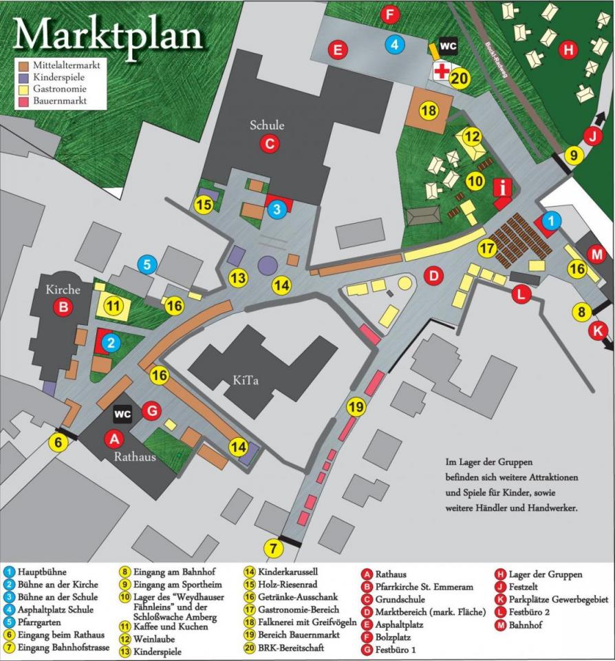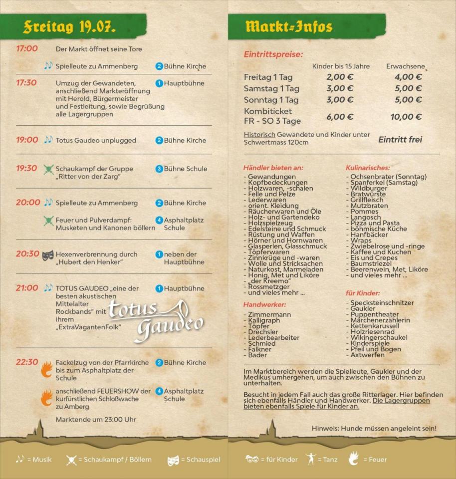 Spielleute, Feuerspucker und Gaukler entführen die Besucher auf drei verschiedenen Bühnen an allen drei Tagen in ein abwechslungsreiches und unterhaltsames Programm. Gerade auch für Kinder gibt es viele Attraktionen im Markt und im Lager.