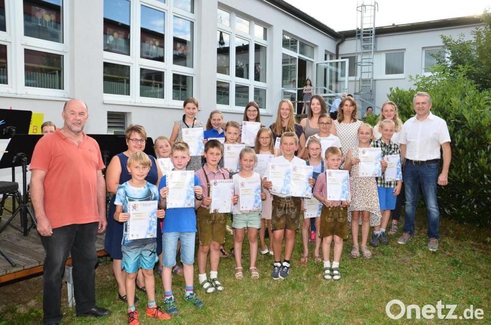 Zweiter Vorsitzender Josef Schmucker verleiht mit musikalischem Leiter Hermann Mack Urkunden an die Absolventen: Einer großen Zahl glückte die Juniorprüfung und weitere Prüflinge unterzogen sich erfolgreich der D-1-Ausbildung. Heraus stach Julius Hornstein, der als erster in der Geschichte der Musikschule auf zwei Instrumenten (Trompete und Klavier) zeitgleich die Qualifikation ablegte. Geprüfte Junioren sind darüber hinaus: Raphael Bauer (Schlagzeug), Maraike Prüll (Gitarre), Lisa-Marie Merold (Saxofon), Tobias Völkl (Akkordeon), Anika Weig (Waldhorn), Antonia Weiß (Klavier), Rigobert Hösl junior (Trompete), Mia-Sophie Gawel (Saxofon), Katharina Puff (Klavier), Johannes Balk (Saxofon) und Sabine Balk (Saxofon). Noch größer fiel die Zahl der bestandenen D-1-Prüfungen aus: Michael Scheibl (Trompete), Kristina Scheibl (Querflöte), Anna Nahrhaft (Klarinette), Marie Knecht (Corno da Gaccia), Sebastian Träger (Schlagzeug), Bastian Völkl (Trompete), Andreas Wüst (Klarinette), Lukas Kleber (Trompete), Laura Kick (Saxofon), Carolin Busch (Waldhorn), Emely Eckl (Klarinette), Annika Hartung (Klarinette), Sophia Ach (Saxofon) und Lena Grötsch (Schlagzeug).