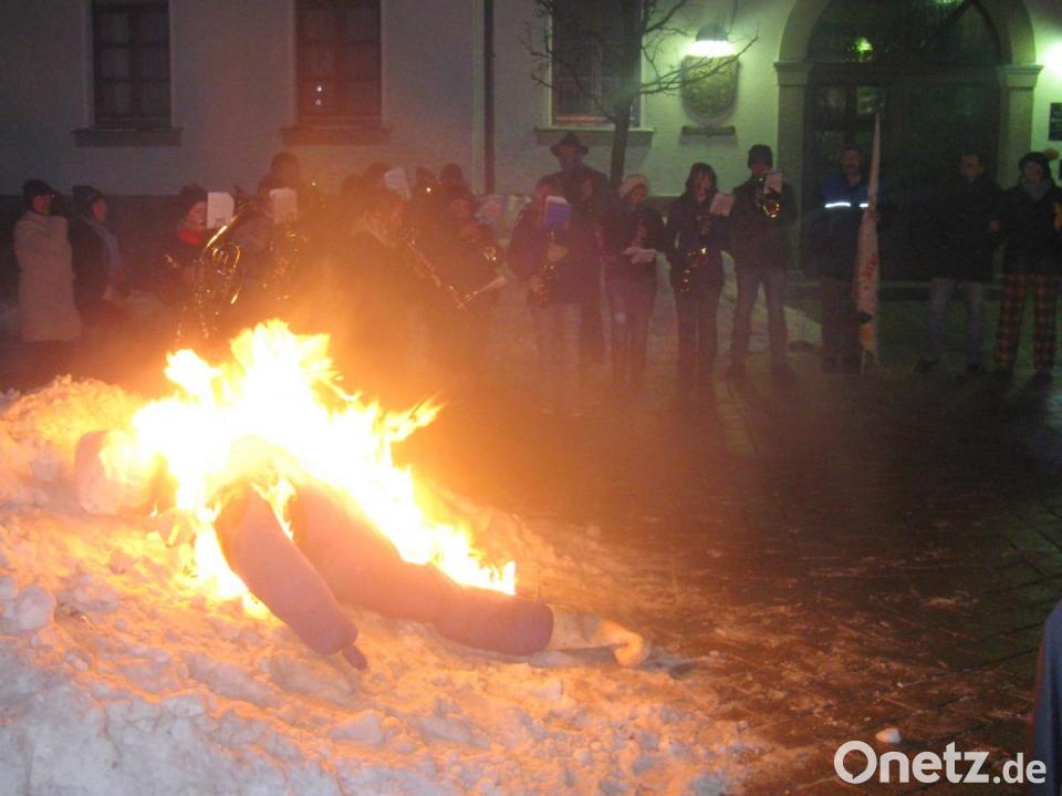 Während der gesamten Strecke durch die Ortsmitte werden Fackeln mitgeführt. Die Musikanten spielen schräge Trauerlieder dazu. Wehklagen und Trauerrufe über die verstorbene Fastnacht dürfen nicht fehlen. Wenn der Zug beim Rathausbrunnen auf dem Marktplatz sein Ziel erreicht hat, übernimmt der zuvor bestimmte Verbrennungskommissar die weitere Handlung. Zunächst ist die Rückgabe des Rathausschlüssels und der Marktkasse an Bürgermeisterin Margit Kirzinger fest eingeplant.