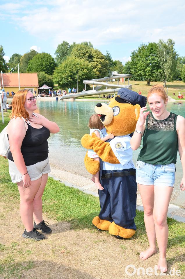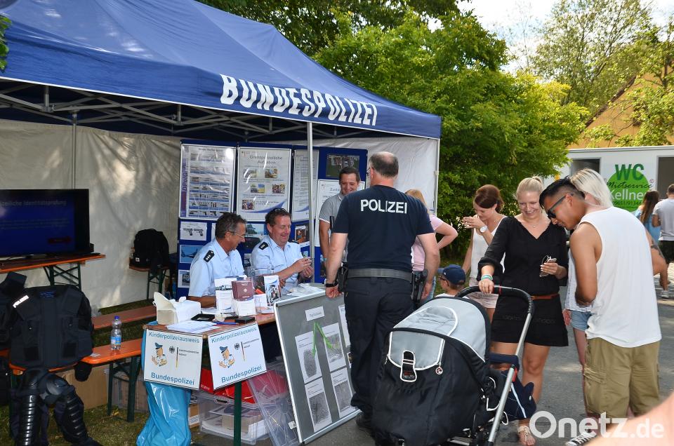 Im Rundgang ließen sich alle Stände bequem erwandern und auch mit Kinderwägen einfach anfahren. Während der gesamten vier Stunden war das Interesse an der Bundespolizei sehr groß. Einem lebenden Maskottchen dürfte ein gehöriger Anteil dabei zugekommen sein. Insbesondere die vielen Kinder ließen sich mit dem mannsgroßen Bären fotografieren. Die Waidhauser Feuerwehr aktivierte einen großen Teil ihrer Jugendlichen. Mit stellvertretendem Kommandanten Hans-Peter Müller informierten sie über ihr Inventar. Das Feuerwehrauto stand für eine genauere Inspektion durch die Gäste direkt am Ufer. Die ins Wasser verlegte Saugleitung diente für eine anschauliche Erklärung. Jugendwart Dominik Zintl stand bei Fragen der Gäste immer wieder gerne Rede und Antwort.
