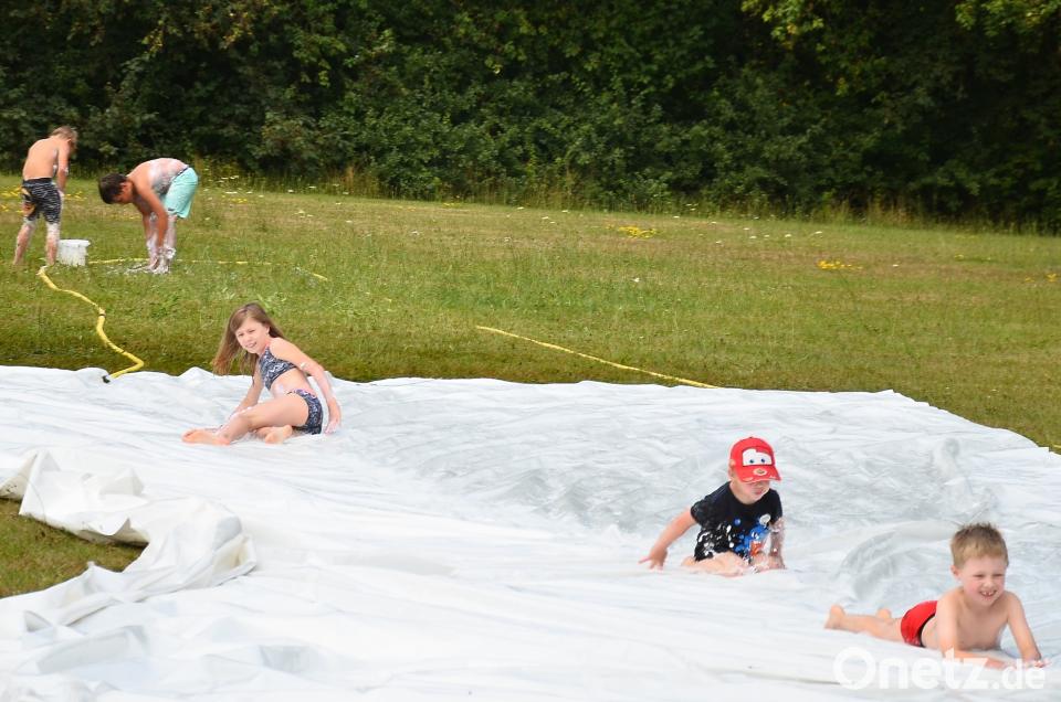 Weil ein durchs ganze Areal gezogener Bauzaun wesentliche Teile der vorhandenen Einrichtungen abgrenzte, rückten die zum Fest eigens aufgebotenen Attraktionen beim Nachwuchs noch mehr in den Mittelpunkt. Schmierseife und Wasserschlauch erhöhten den Spaß auf der am Hang aufgelegten Plastikplane ungemein. Mit etwas Anlauf ging es viele Meter weit im Sauseflug die Liegewiese hinunter. Zudem war es der einzige Punkt, an dem Badehosen erlaubt waren. Eine große Hüpfburg ragte mitten aus den Sitzgarnituren, die aber nur mäßig Nachfrage fanden.