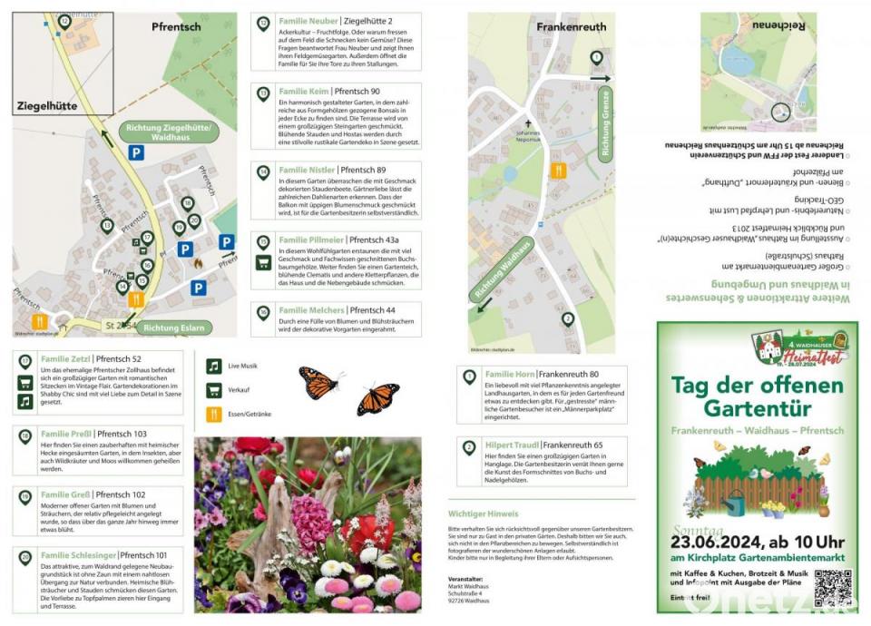 „Hereinspaziert!“ Das heißt es in Waidhaus zum „Tag der offenen Gartentür“. Diese bayernweite Veranstaltung ist üblicherweise am letzten Sonntag im Juni. Dieses Wochenende ist aber vom 28. bis 30. Juni mit dem 125-jährigen Gründungsjubiläum der Feuerwehr Hagendorf belegt. Die Gartentüren öffnen sich deshalb in Waidhaus mit seine Ortsteilen Pfrentsch, Ziegelhütte, Frankenreuth und Reichenau bereits am 23. Juni.
