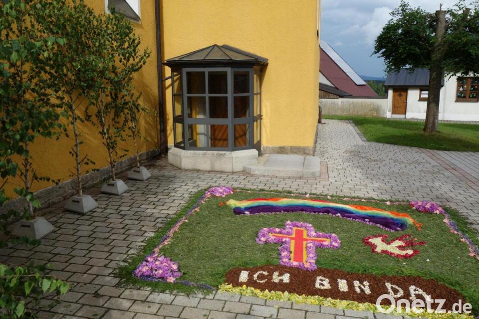Mit der sonst farbenfrohen Fronleichnams-Prozession ist es heuer nichts geworden. Die Verbote ließen der katholischen Pfarrgemeinde keine Wahl. Ein Helferteam um Mesnerin Margit Reichenberger ließ es sich jedoch nicht nehmen, zumindest einen Blumenteppich zu gestalten. Auf dem ebenen Vorplatz bei der Emmeramskirche entstand in den frühen Morgenstunden ein groß dimensioniertes Kunstwerk. Rund um die göttliche Zusage „Ich bin da“ schufen die Beteiligten ein ausdrucksstarkes Gesamtbild. Kreuz und Taube als christliche Symbole setzten die Mithelfer eindrucksvoll ins Szene. Während des Feiertags kamen immer wieder Gäste, um sich selbst ein Bild von der Arbeit zu machen. Sofern es die Witterungsverhältnisse zulassen, ist ein Beseitigen erst zum Wochenbeginn beabsichtigt. Damit soll der Bevölkerung noch ausreichend Gelegenheit zum eigenen Bestaunen gegeben werden.
