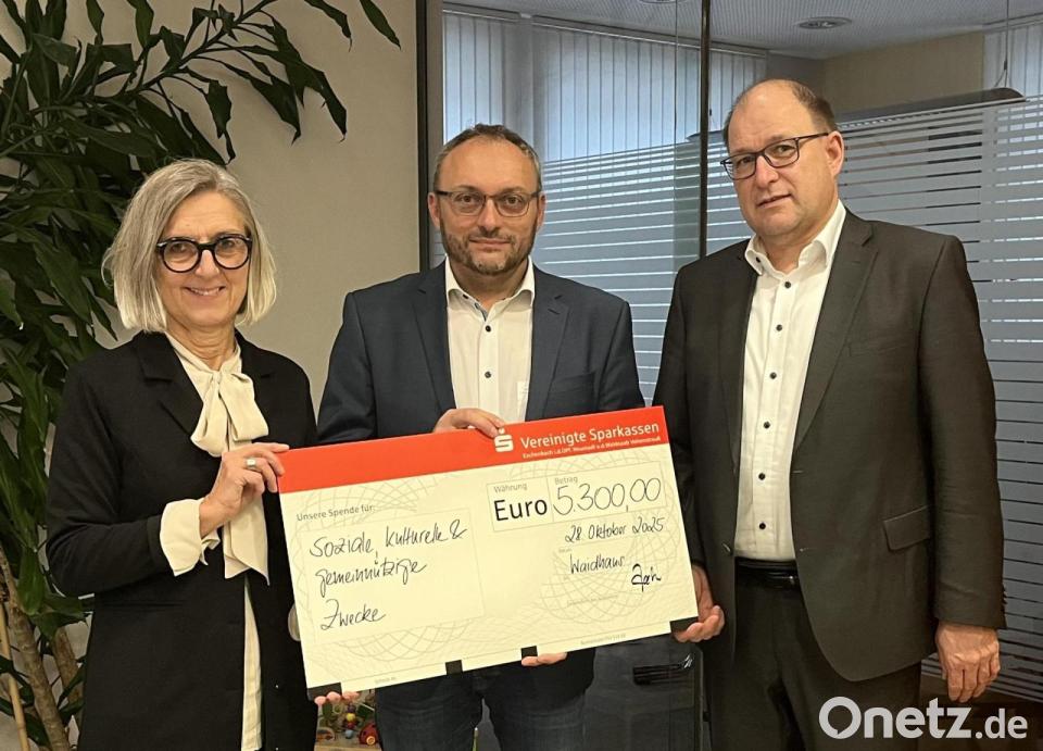 Die Vereinigten Sparkassen Eschenbach-Neustadt/WN-Vohenstrauß haben 5300 Euro an 14 Vereine, Organisationen und kirchliche Institutionen in Waidhaus gespendet. Die Spendenübergabe fand am vergangenen Dienstag statt, wie die Sparkasse mitteilt. Monika Höllerer, Kundenberaterin, und Johann Zach, Vorstandsmitglied, überreichten den symbolischen Scheck an Bürgermeister Markus Bauriedl.