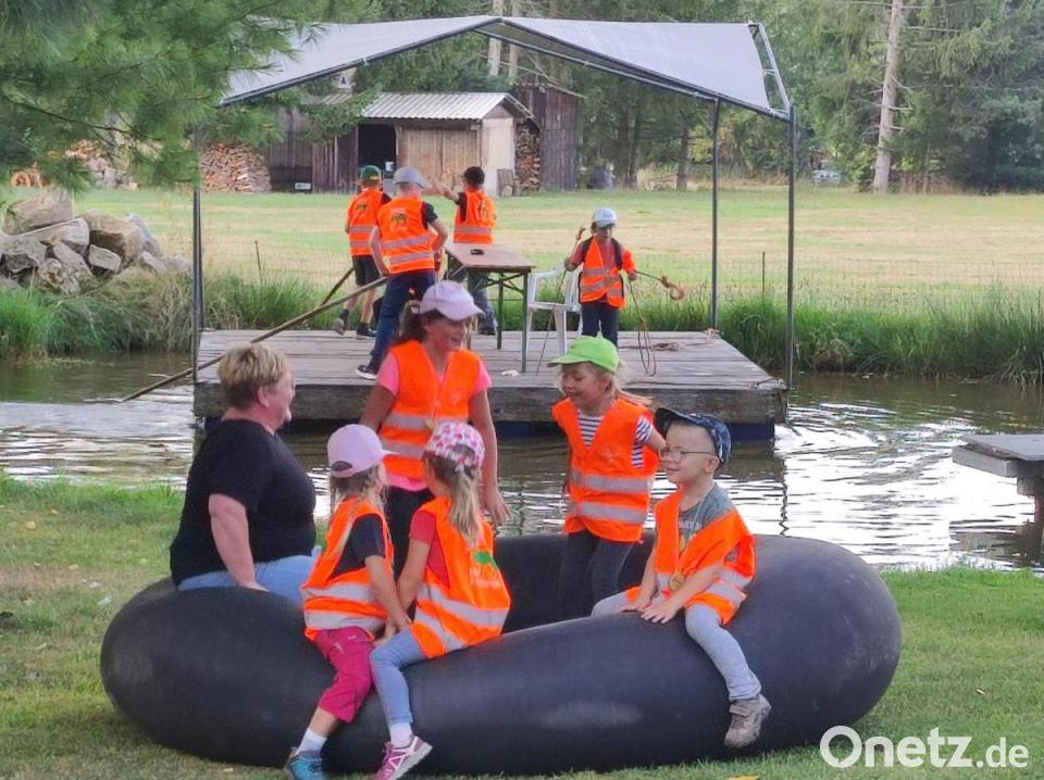 Im Anschluss gab es zur Stärkung Würstchen, Stockbrot und Kartoffeln und die Kinder konnten unter Aufsicht auf dem Floß im Weiher fahren. Ein großer aufgeblasener Traktorreifen sorgte ebenfalls für viel Spaß.