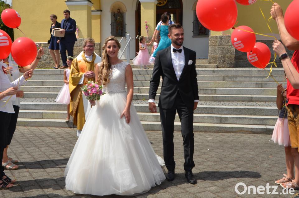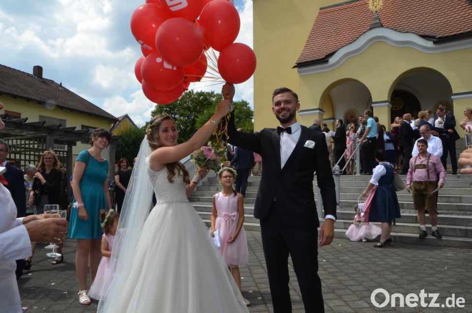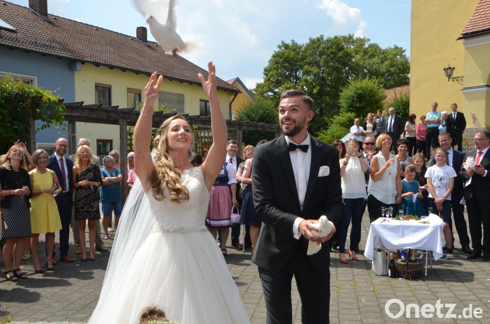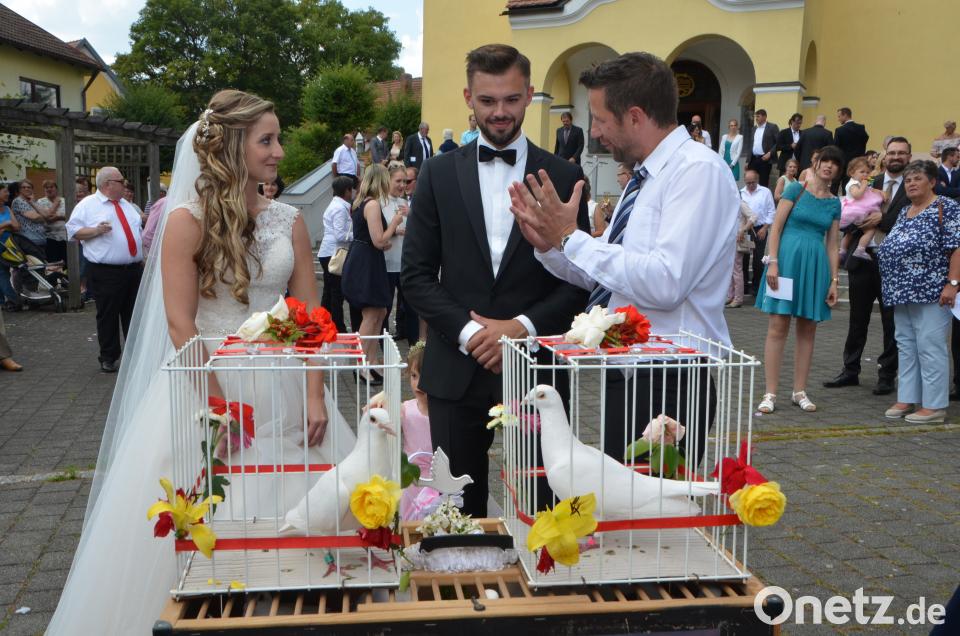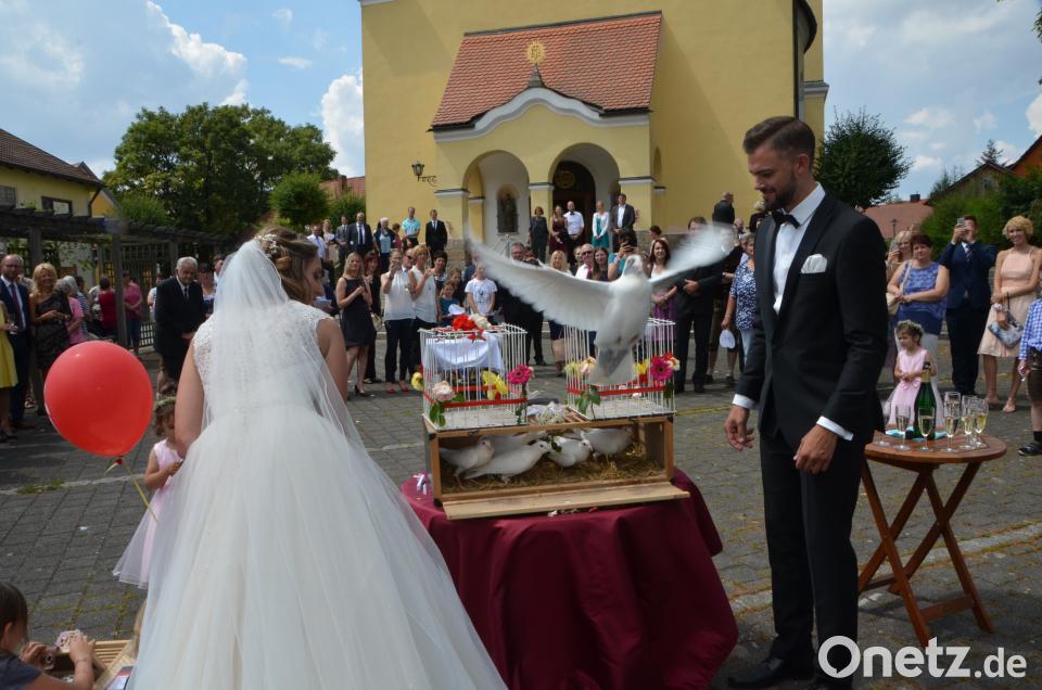 Am Kirchenportal empfingen die Kollegen der Vereinigten Sparkasse das Brautpaar. Immerhin arbeiten beide als Bankkaufleute bei der Sparkasse in Neustadt/WN. Gefunkt hat es dann vor sechs Jahren beim Weiberfasching in Moosbach. Überall auf dem Kirchplatz baumelten rote Sparkassen-Luftballons, die anschließend aufstiegen und vom großen Glück der Eheleute zeugten. Martin Vitzthumaus Lennesrieth brachte seine Hochzeitstauben mit für diesen unvergesslichen Tag. Josef Frisch, Onkel des Bräutigams, hatte mit seiner Familie dieses romantische Ritual organisiert. Seit jeher haben Tauben eine starke Symbolik für Liebe, Frieden und Treue. Haben sich zwei Tauben einmal gefunden, verbringen sie den Rest ihres Lebens miteinander. Diese Eigenschaften wünschten auch die Schenkenden dem Brautpaar unter strahlend blauem Himmel. Nachdem alle Tiere in die Freiheit entlassen wurden, durfte das charmante Paar viele Glückwünsche, auch von der Waldauer Bevölkerung, entgegennehmen. Danach ging es zur Hochzeitsfeier ins Sporthotel Kleber nach Tännesberg.