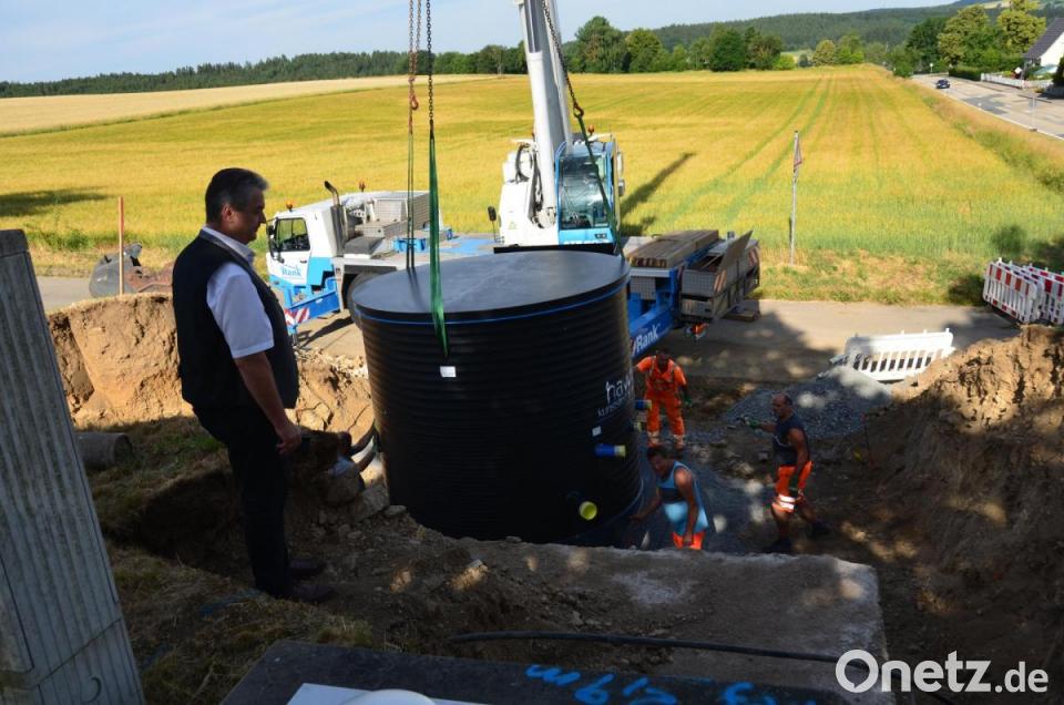 Um die Wasserversorgung in gleicher Qualität und mit passendem Druck anzubieten, wird auf Höhe Waldau wird ein neuer Übergabeschacht gesetzt. Der Koloss wiegt vier Tonnen und wurde per Kran in die dafür vorgesehene Plattform gehievt, die Bauhofmitarbeitern vorbereitet hatten. An der Richtung Neumühle führenden Gemeindeverbindungsstraße wurde dazu am Hügel Erdreich abgegraben. Mit einer Gesamtlänge von 3,50 Metern und einem Durchmesser von 2,50 Metern hievte der Kran den Kunststoffbehälter zentimetergenau unter Anweisung der Bauhofmitarbeiter und Bauamtschef Michael Gösl heran. Die Gesamthöhe beträgt immerhin 2,60 Meter, denn er ist begehbar und mit einer Tür versehen. Die Eingangspforte wird auch das Einzige sein, was später davon noch zu sehen ist, denn der monolithische PE-Baukörper verschwindet wieder im Erdreich. Der Vorgänger in Betonbauweise war erneuerungs- und sanierungsbedürftig. Früher musste in diese Behälter von oben eingestiegen werden. Die Arbeitssicherheit des Personals hat oberste Priorität und deshalb war der Eingang nun von der Straßenseite her zwingend notwendig. Im Schacht verbauen die Bauhofmitarbeiter die gesamte Steuerungstechnik mit Druckminderer und elektronischem Schieber. Von da aus wird die Wasserversorgung in den Ortsteilen beziehungsweise Weilern und Anwesen in Waldau, Trasgschieß, Iltismühle, Roggenstein, Lämersdorf, Zieglmühle, Binnermühle, Hammer, Luhmühle, Oberschleif, Unterschleif, Zieglhütte, Erpetshof und Zeßmannsrieth versorgt, informierte Bauamtsleiter Markus Wildenauer. Der Druckmindererschacht sei Bestandteil der Wasserversorgung „Vohenstraußer Gruppe“, dessen Wasser vom Wasserwerk Neumühle beziehungsweise aus dem Fahrenberg-Hochbehälter fließt.