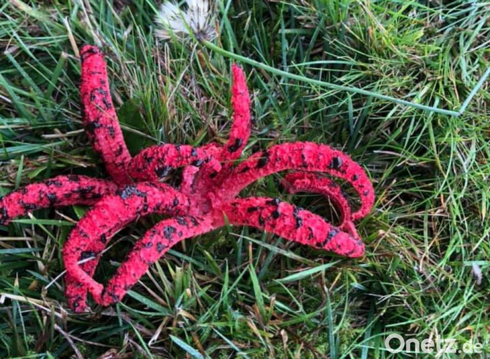 Ein Ehepaar aus Köln, das derzeit Urlaub in Waldeck bei Kemnath macht, fand beim Spazierengehen einen Tintenfischpilz. Den rot leuchtenden Pilz, der wie ein Krebs aussieht, entdeckten die Urlauber auf einer Wiese neben einer Scheune. Der Pilz hat einen Durchmesser von ungefähr zwölf Zentimeter und ist etwa vier bis fünf Zentimeter hoch. Die Finderin geht eigentlich nicht auf Schwammerlsuche und musste sich über das ungewöhnliche Schwammerl erst in Internet kundig machen. "Wir haben den Tintenfischpilz stehen lassen und nur fotografiert", sagt die Frau aus Köln.