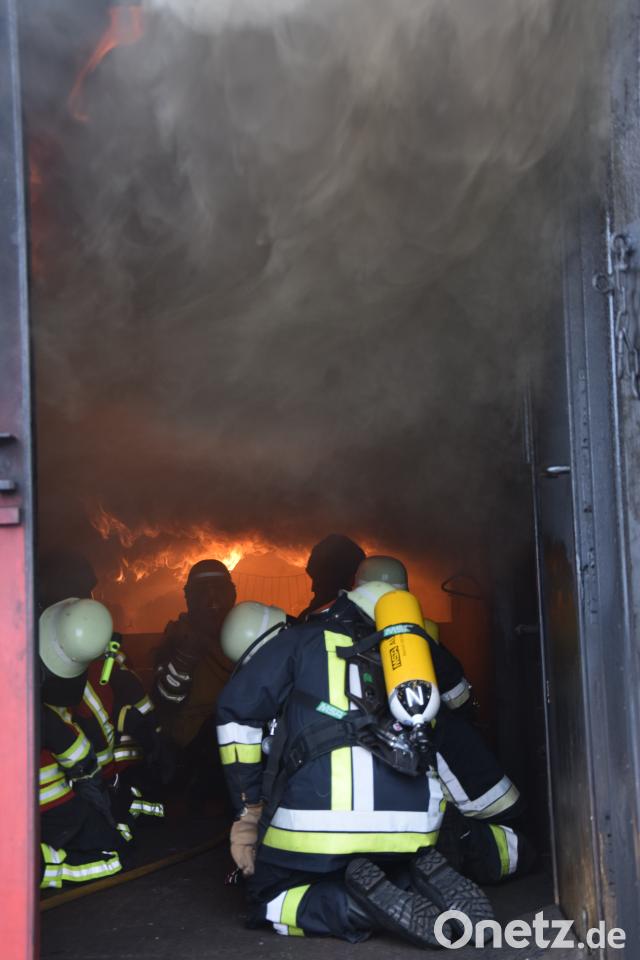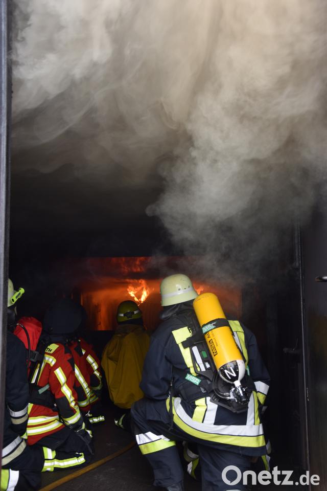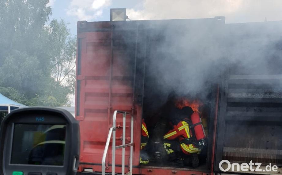 Durch die unterbrochene Luftzufuhr herrschte eine "unvollständige Verbrennung". Nach dem Öffnen der Containertür zog das Feuer ersichtlich die Frischluft an. Umgehend stand der vordere Teil des Containers in hellen Flammen. Die brennbaren Gase in der Rauchschicht entzündeten sich und zogen in Form von Flammenzungen über die Feuerwehrleute hinweg. Den Beginn der Rauchgasdurchzündung konnten die Teilnehmer hierbei kurzzeitig auf sich wirken lassen, ehe mit kurzen Sprühstößen das Feuer in den Löschübungen eingedämmt wurde.